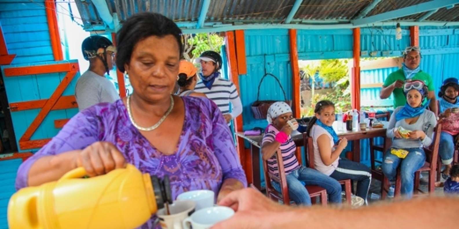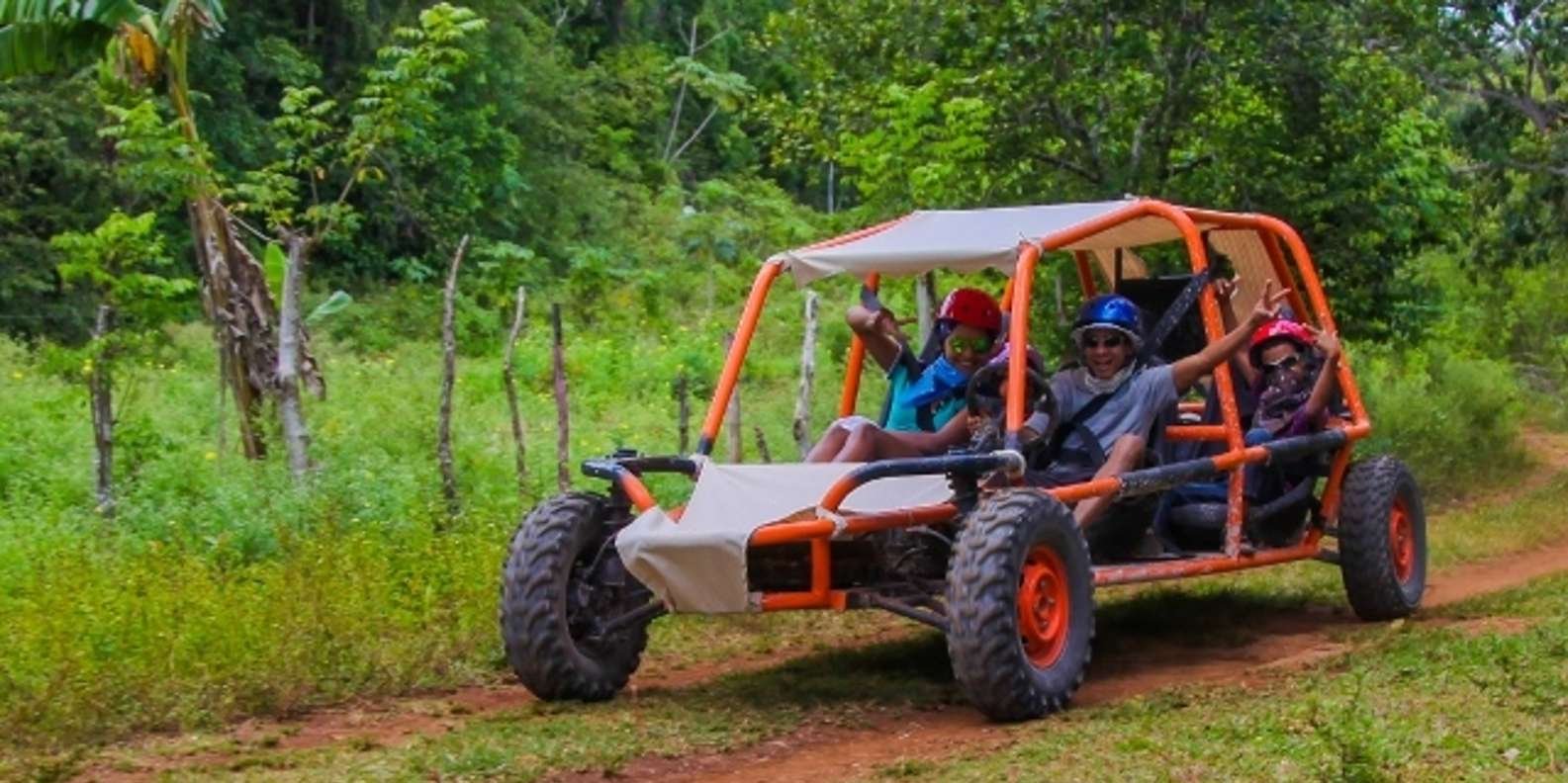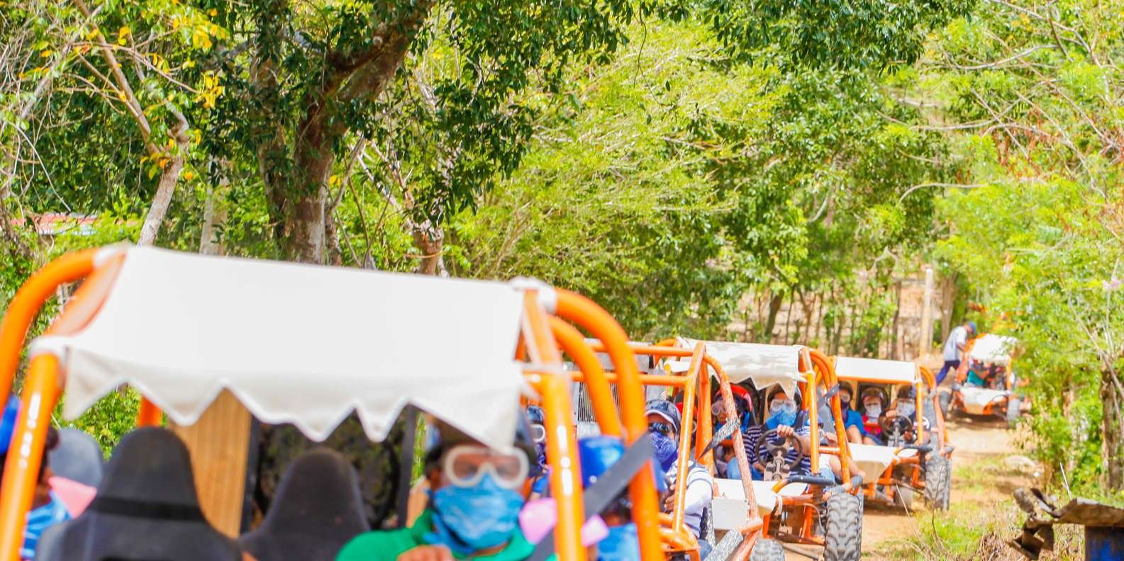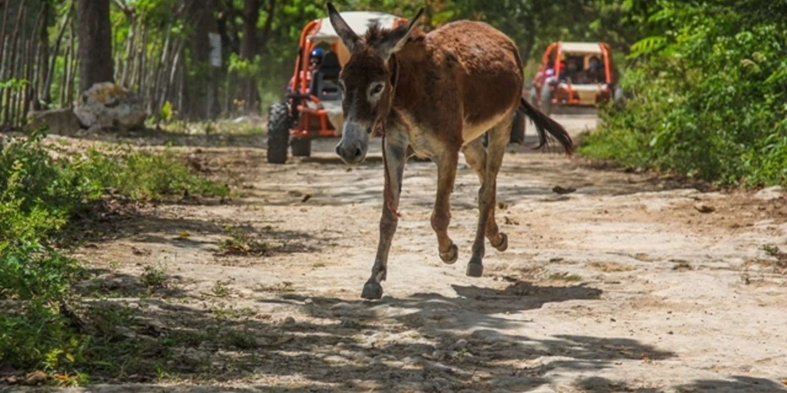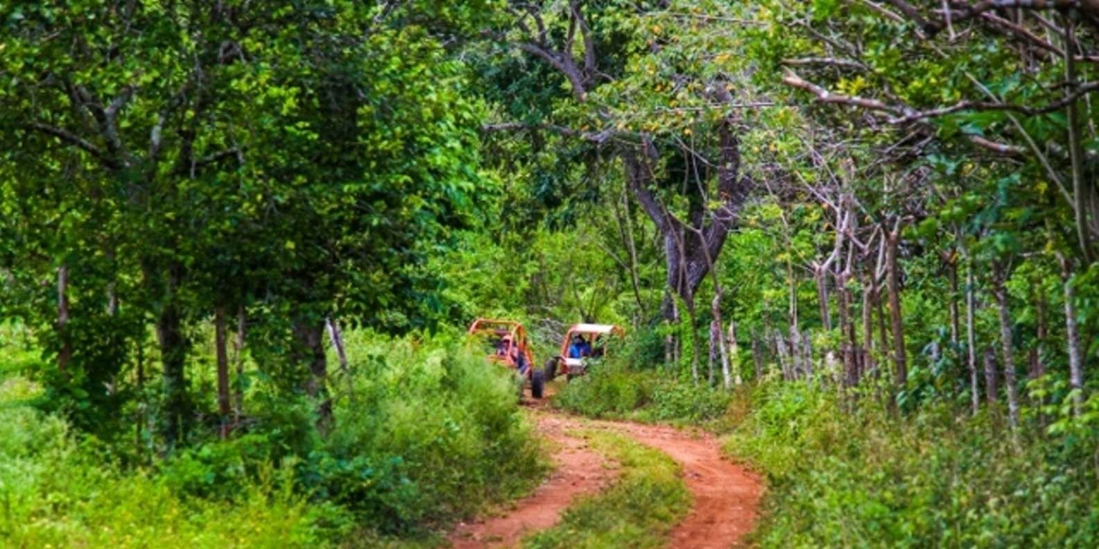 This amazing tour starts at a conveniently located ranch in the heart of Bavaro. All passengers will receive instructions about the safety and operation of the vehicles. Guests will be driving their own automatic buggy, following the tour guide who will lead the group. The trail has a length of 10 kilometers and takes you through a variety of vegetation and rock/hill-formations. The trail goes straight through the countryside where you can see donkeys, cows, horses, sheep, pigs and many different types of birds. After about  25 minutes of driving, the first stop is at a typical Dominican Campo, and the local “colmado” (a small grocery store) where participants can taste some real Dominican coffee. Immerse yourself in the Dominican culture as you join locals from the countryside doing their daily shopping.